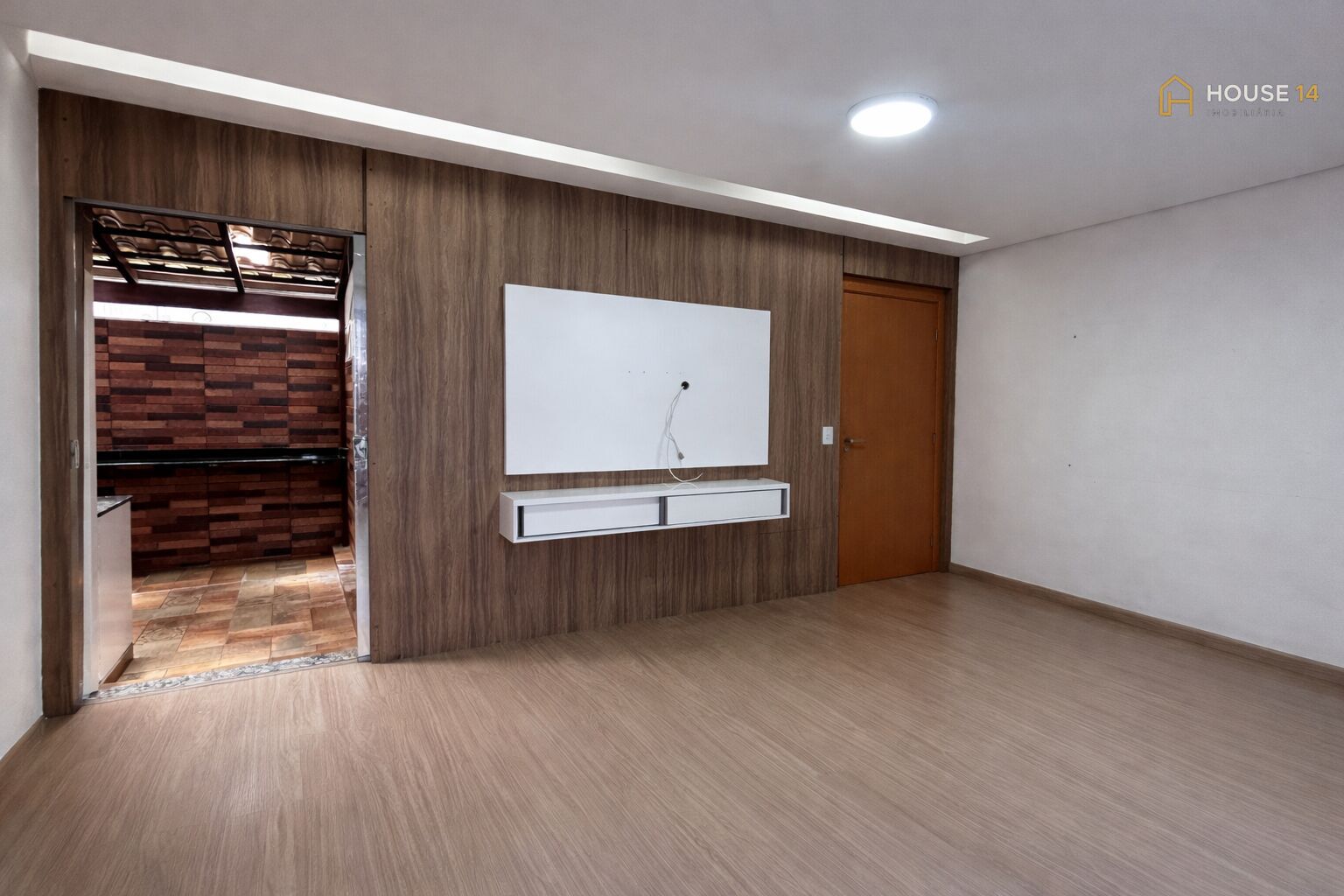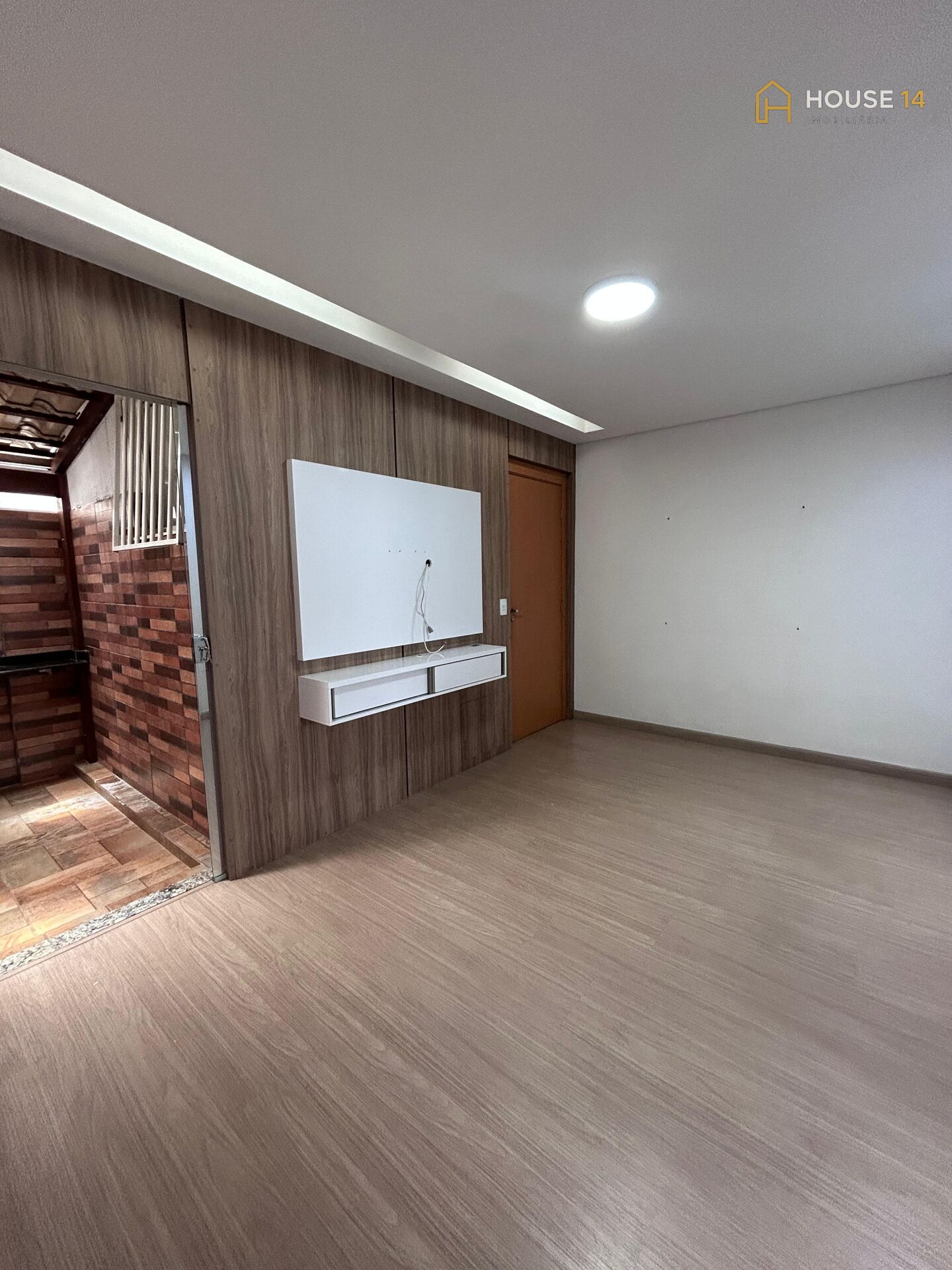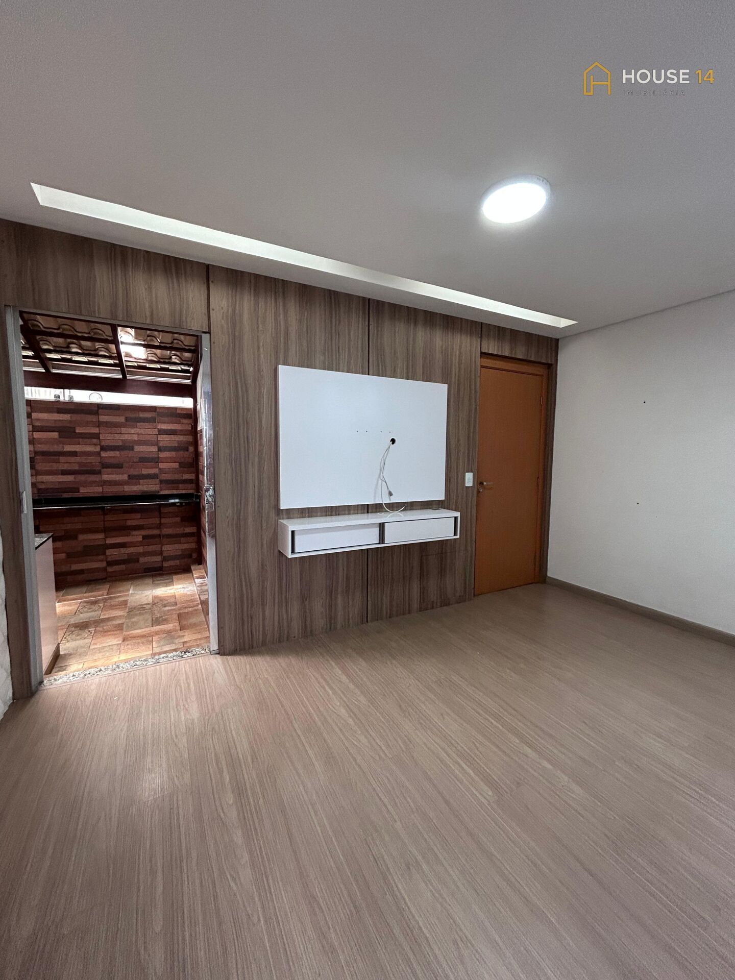 🛋 Sala aconchegante com teto rebaixado em gesso, parede planejada em madeira, painel branco para TV com gavetas e detalhe em gesso trabalhado dividindo os ambientes.